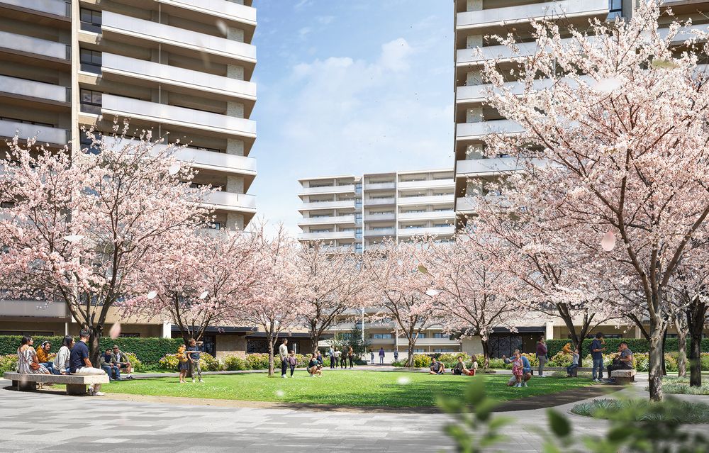 根川さくら通りに接する住棟からは春の桜並木を間近に楽しむことができ、季節の彩りを日常に取り込む。敷地内には、春を象徴する「サクラノソノ」「サクラリング」をはじめ、イチョウゲートやフォレストプロムナードなどを配置し、四季を通じて自然を感じられる街づくりを推進していく。また、敷地の約 1ha を公園や遊歩道として整備し、地域に開かれた潤いある環境を形成する。