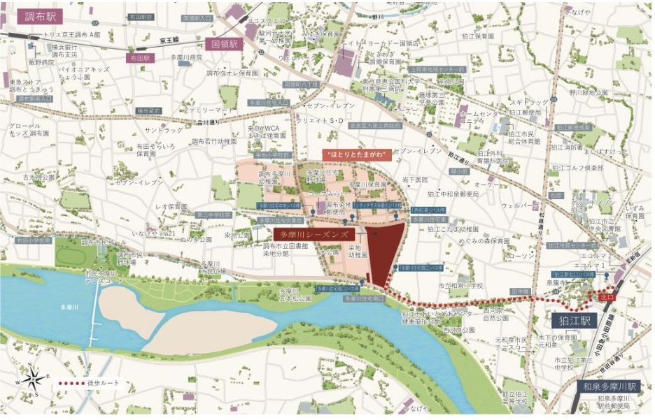 交通 小田急線「狛江」駅:C 棟・D 棟徒歩 20 分/A 棟・B 棟徒歩 22 分 小田急線「和泉多摩川」駅:C 棟 19 分/B 棟・D 棟 21 分/A 棟 22 分 京王線「国領」駅:A 棟 21 分/D 棟 22 分/B 棟・C 棟 24 分 A 棟・B 棟徒歩 3 分、C 棟徒歩 1 分、D 棟徒歩 2 分の小田急バス「多摩川住宅南口」(のりば 2)バス停から「狛江駅北口」バス停まで約 8 分 A 棟・D 棟徒歩 2 分、B 棟・C 棟徒歩 4 分の小田急バス「西和泉」バス停から「狛江駅北口」バス停まで約 10 分 A 棟徒歩 2 分、B 棟・C 棟徒歩 4 分、D 棟徒歩 1 分の京王バス「西和泉」午前回り専用バス停から「調布駅南口」バス停まで約 22 分