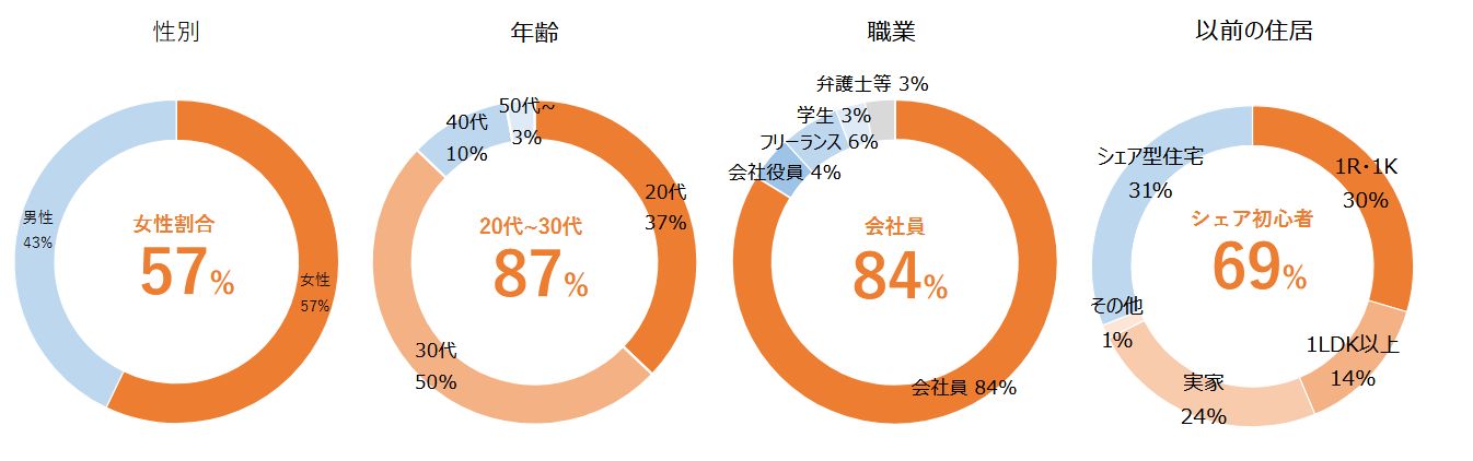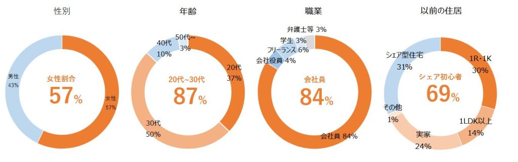 「TOMORE 品川中延」では、入居者全体の 8 割以上が会社員、内約 7 割が上場企業や大手外資系企業に勤務。従来の賃貸住宅ではなく、あえて「コリビング賃貸レジデンス」を選び、次世代のライフスタイルを実践する点も特徴。20代から30代の若い世代が多く、女性比率が57%と高いのも特徴だ。