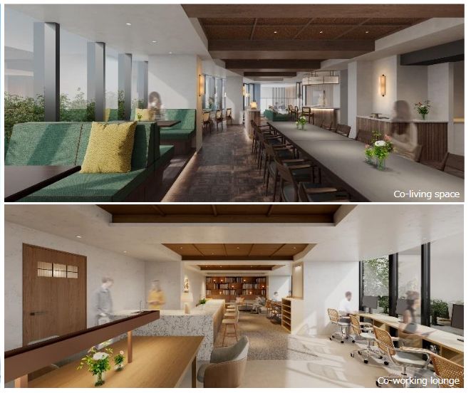 コリビングスペースは、 ホテルライクで開放感に溢れ、日常生活を快適にくつろげる共用リビング。 リビング、ダイニング、キッチンを備え、ホテルライクな家具や家電を設置。 コワーキングラウンジは、 空間や設備面で働くための機能性を兼ね備えた、快適なワーク環境とした。専属運営スタッフによるコミュニティ運営も特徴だ。専属運営スタッフ「コミュニティオーガナイザー」が滞在し、日々のコミュニケーションやトークイベント等を通じて、入居者様同士の自然な交流を創出することで、一般的なシェアハウスやシェアオフィスとは異なり、新たな繋がりや活動機会を自然と生みだす役割を担う。