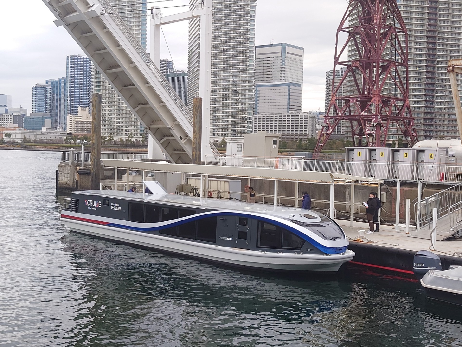 2026 年 4 月から、日本橋・豊洲間で 2 隻運航開始予定。本船への電力(再生エネルギー)は、ららぽーと豊洲内にある高圧受電設備から送電・再変圧し、4 基の急速充電器で供給する。