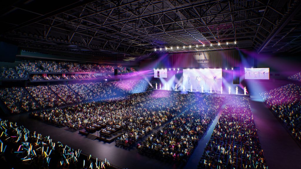 また、 感動のエンターテインメント空間の活用も。ライブ・コンサートを中心とした各種イベントの開催が可能。50m×12m の大型ビジョンを設置し、多彩な演出を行うとともに、一つ一つの座席も前後左右のゆとりをしっかりと確保することでエンターテインメント空間を創出。約 2.5 万人規模の屋内全天候型多目的ラグビー場で、都心に位置することから平日の来場も容易となっており、国内外トップクラスのアーティスト公演によるエンタメの中心地となることを目指す。