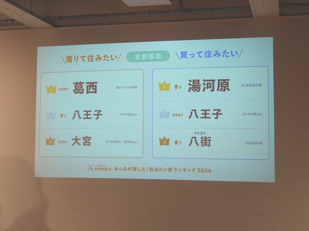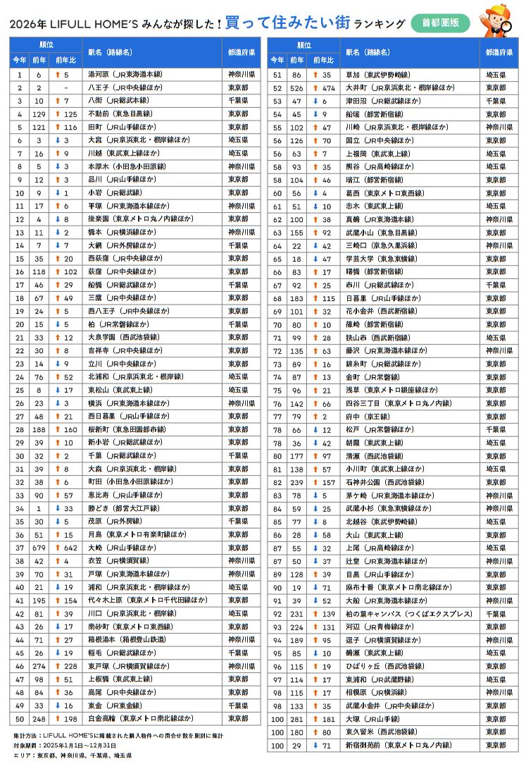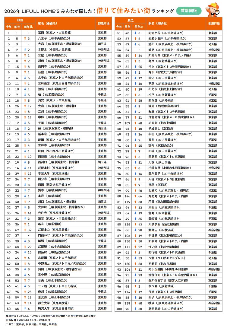 ズ)」は、「2026 年 LIFULL HOME’S みんなが探した!住みたい街ランキング(首都圏版)」を公表した。毎年行っているLIFULL HOME’S に掲載された物件への「問合せ数」を駅別に集計したユーザーの本気で探した街がわかるランキング。2025年は、昨今の物価高騰や不動産価格の上昇を反映するような結果となっている。